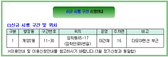 | 제목 | 신규구간 11-30 계양2동(임학안로 6번길 부근) 신청안내 | ||